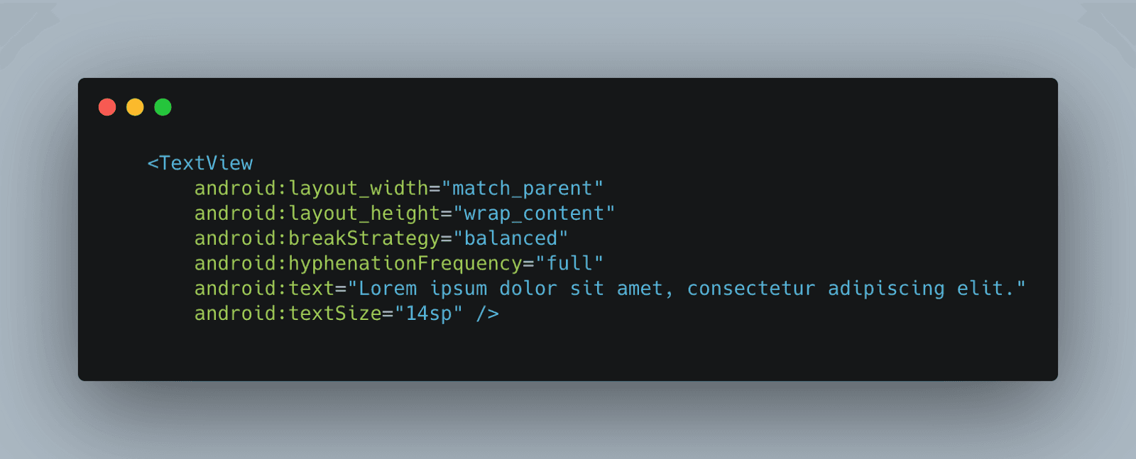 Android 에서는 android.widget.TextView클래스를 통해 텍스트 레이아웃 측정을 도와주고 있습니다. 앞서 언급한 Layout Measuring 에 관한 다양한 디테일(text size, line breaking strategy, hyphenation frequency) 들은 대부분 xml attributes 로 조정이 가능하여 해당 attributes 에 맞추어 배치된 글자들이 화면에 그려지게 됩니다.