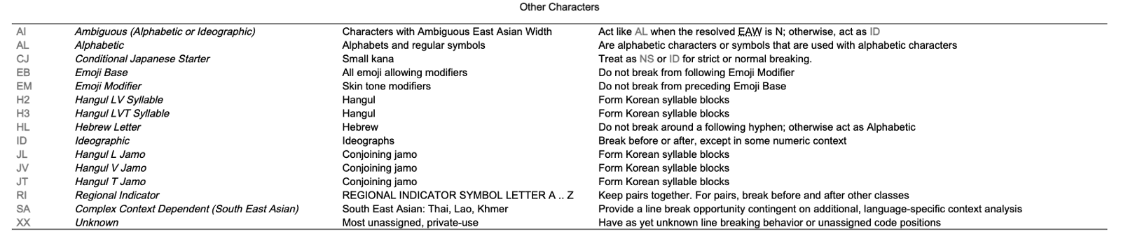 줄넘김 처리가 발생할 수 있는 지점 (이하 중단점) 은 각 unicode Locale 별로 차이가 있습니다. 해당 Unicode 규약은 여기에서 볼 수 있는데, 예를 들자면 영어의 경우에는 한 단어의 중간 에서는 줄넘김 처리가 발생할 수 없고, (만약 발생한다면 - 표시를 추가해 주어야 합니다.) 한글의 경우 한 단어 사이 음절에서 줄넘김 처리가 발생할 수 있습니다.