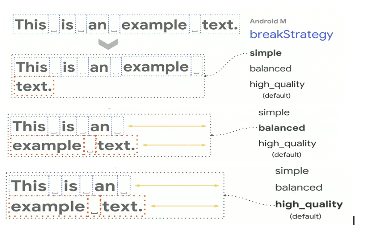 Line Breaking strategy comparison from Deep dive in Android Text And Best Practice